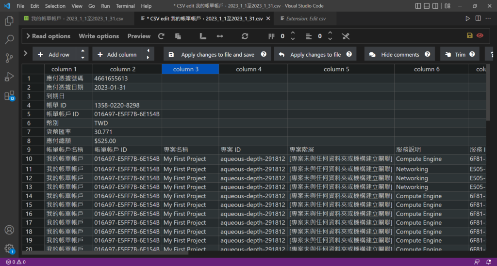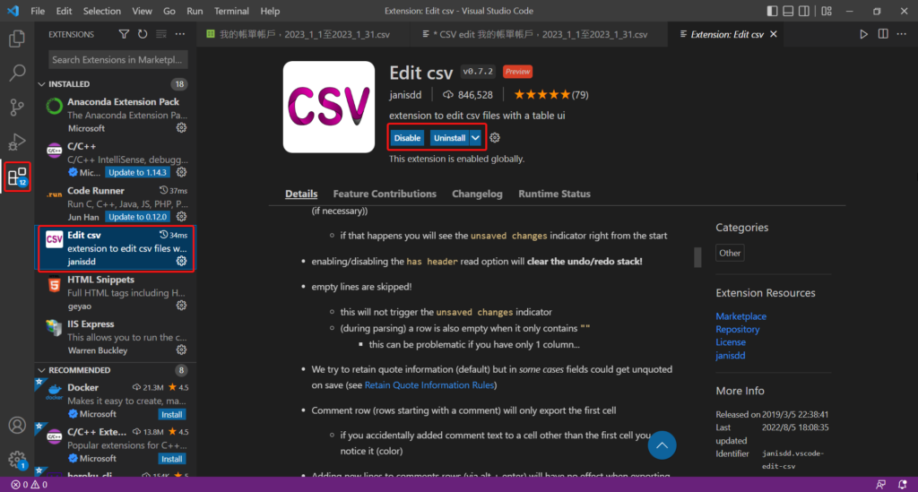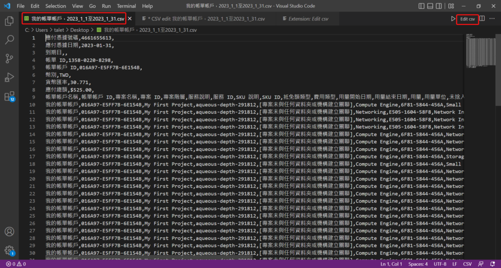 首先VS Code中先安裝Edit csv外掛,安裝完成後。